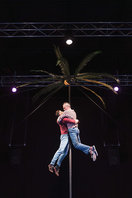 Sur scène il n’y a qu’Arnaud, Samuel et un mât chinois de 5 m 50. Histoire d’attendrir l’engin, ils l’ont coiffé de palmes de cocotier et orné de bananes. Il est le point culminant de leur île.
