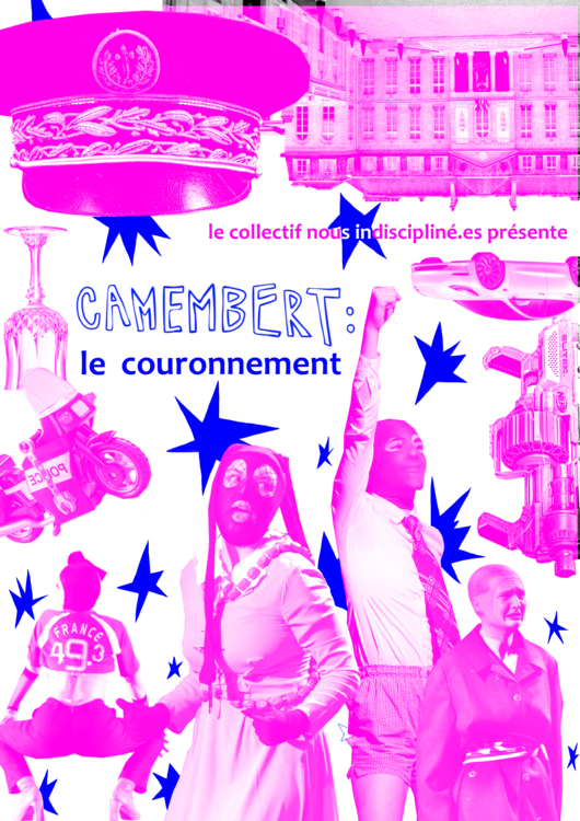 Sur scène, une nonne aguicheuse et son père Le Daron BDSM, une mort multimilliardaire en cape noire, un préfet sans slip et sans peur, une bourgeoise un peu trop attachée à ses petits agents de Police, un futur président noyé dans ses daddy issues et un présentateur corrompu à la fleur de lys. Tout au long de la pièce, le public est mis en mouvement par une voix surplombante. On l’entend répéter inlassablement : jour, nuit, jour, nuit, jour, nuit, jour, nuit. Les spectateurices ont le choix de s’y soumettre ou non. Le choix de fermer les yeux quand on le leur dit ou non. C’est donc sous la forme d’un zapping TV, Camembert : le couronnement dresse la satire d’un système capitaliste, bourgeois, patriarcal et né d’une culture chrétienne. Le ton est direct, parfois provocateur, souvent parodique. C’est une esthétique burlesque, drag et militante qui habille la pièce : paillettes, cagoules, talons et pancartes en carton. Au plateau, nos corps queer chantent en chorale, lipsync des tirades de queen Marlène Schiappa, lisent des contes au public et dégustent à genoux l’Ostie, la langue tendue vers des mains pieuses de cuir noir.