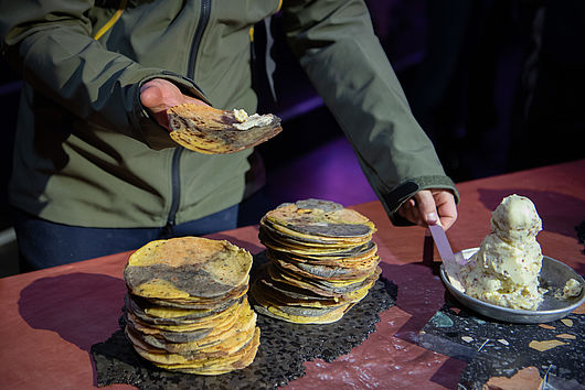 Nous proposons aux participants (et aux autres) de faire les fonds de placards, les fonds de paquets, “les presque rien”, les quantités négligeables, et de collecter tous restes de farine, de légumes secs, d’herbes, de plantes comestibles (sapins, pétales etc.) d’épices etc.. afin de participer à un atelier de fabrication de pitas composites. Des pains plats à plusieurs zones, plusieurs, couleurs et saveurs que l’on explore de manière presque géographique.