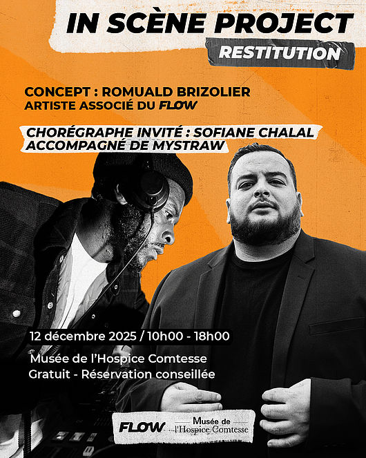 Le Labo danse Hip-Hop du Flow se pose cette année au Musée de l’Hospice Comtesse autour du projet «IN SCÈNE PROJECT" porté par le chorégraphe Romuald Brizolier, artiste associé au Flow de Lille. Accompagné de 8 danseurs professionnels et de deux invités : le chorégraphe Sofiane Chalal et le beatmaker Mystraw. Pour ce laboratoire d’expérience scénique qui cherche à créer de nouveaux espaces pour penser la danse Hip Hop autrement, le Musée de l’Hospice Comtesse s’offre comme un merveilleux « écrin » pour repousser les frontières du style, de l'intention et de la narration.