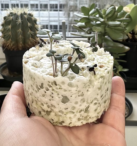 Après de nombreux tests aux laboratoires UCCS et BioEcoAgro, Desislava Stoilova poursuit sa résidence AIRLab en faisant croître diverses plantes capables de s’épanouir à la fois à la surface et dans les pores du verre de ces sculptures.