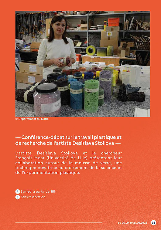 À l’occasion des Journées Européennes du Patrimoine de 2025, Desislava Stoilova et François Méar, enseigant-chercheur à l’UCCS (Unité de Catalyse et de Chimie du Solide), ont donné une conférence au MusVerre. Ils ont raconté le cheminement de leurs recherches autour de la mousse de verre, menées jusque là durant sa résidence AIRLab.